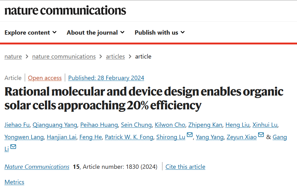 近日,K1体育陆仕荣团队联合香港理工大学、中国科公司重庆绿色智能技术研究院,基于光伏材料结构创新,在有机太阳能电池领域取得突破性进展,再次刷新单节有机太阳能电池世界最高效率记录。此成果“Rational molecular and device design enables organic solar cells approaching 20% efficiency”发表在《Nature Communications》上。陆仕荣研究员、李刚教授、肖泽云研究员为该论文的共同通讯作者,杨乾广老师和付杰浩博士为该论文的共同第一作者。